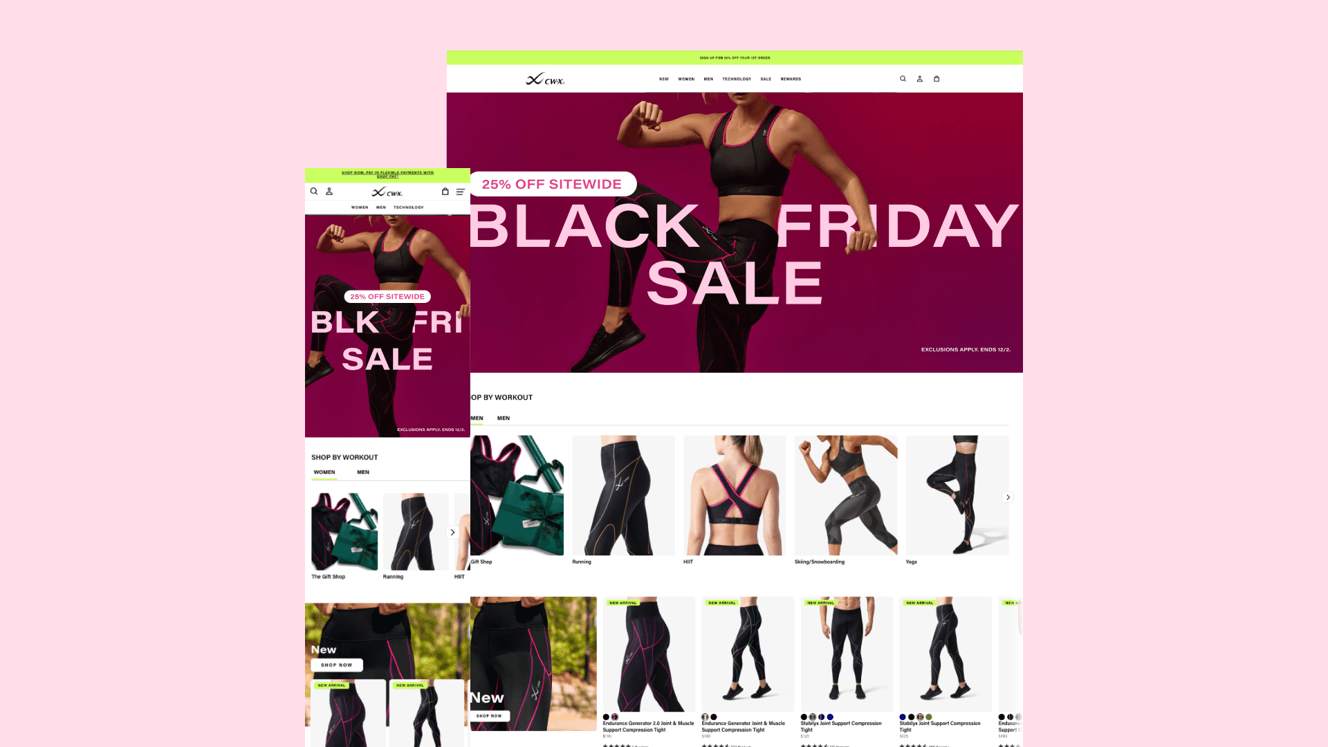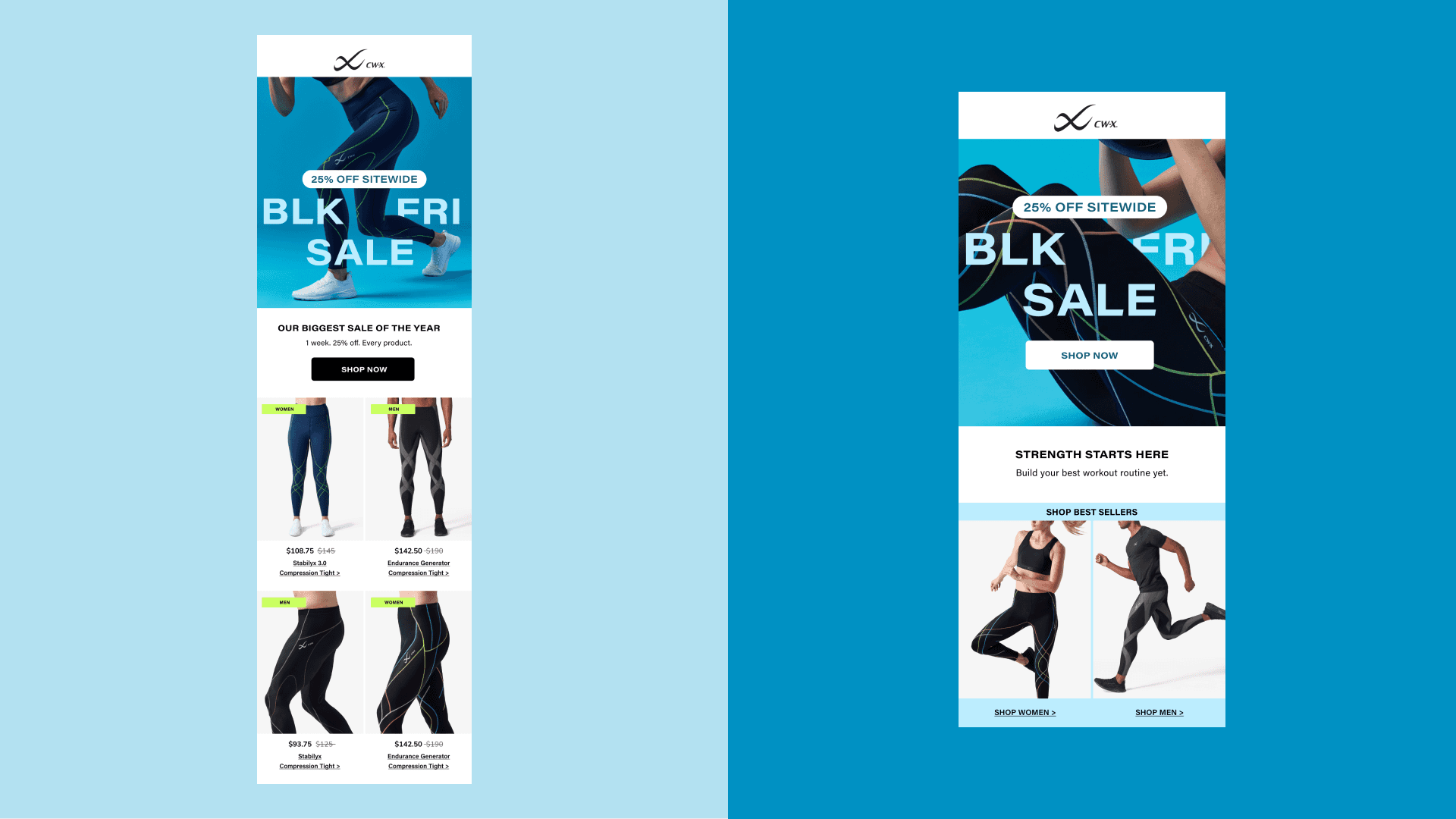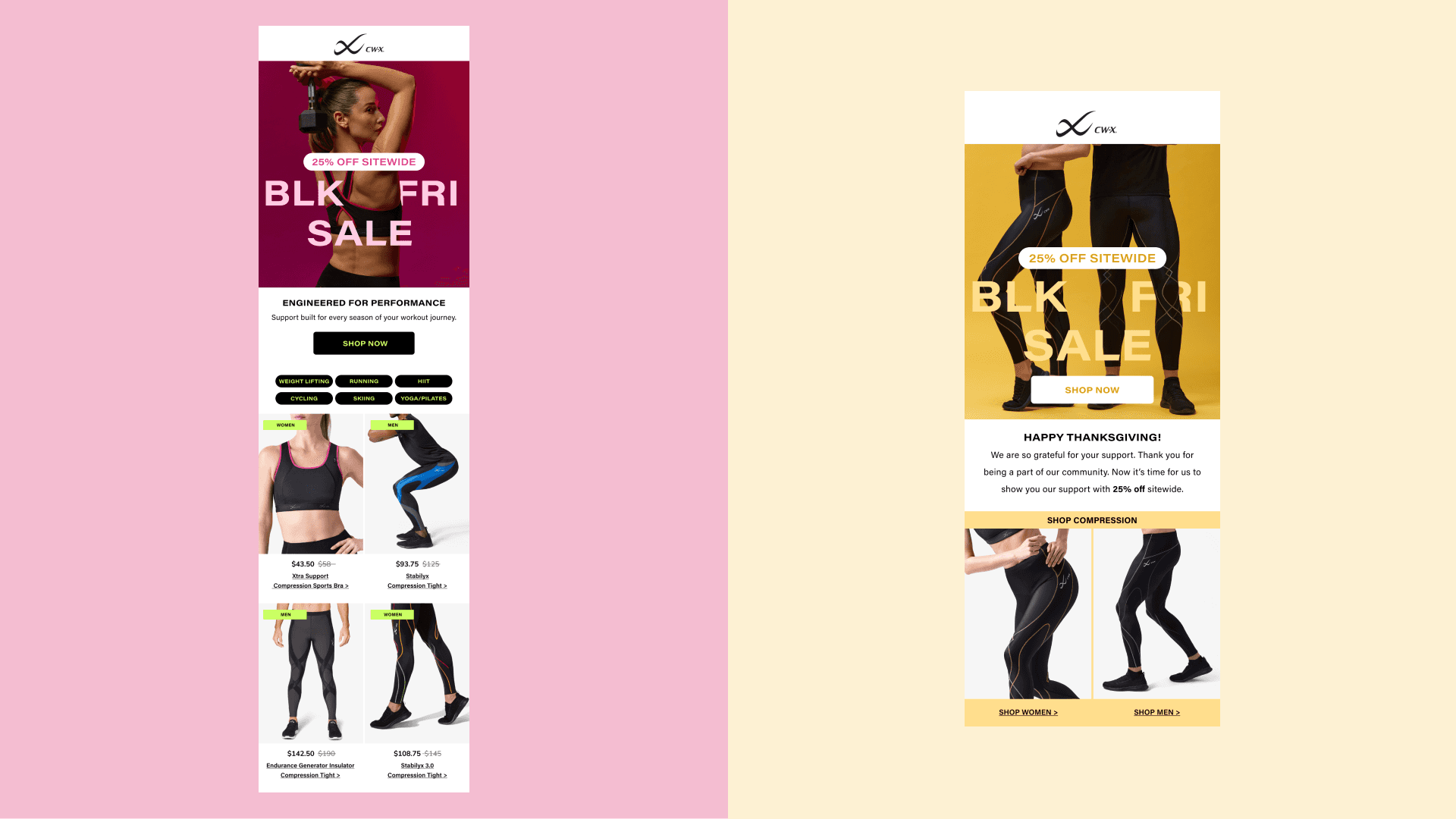 For CW-X’s Black Friday campaign, I designed bold, high-impact visuals using bright imagery from the Fall eCommerce shoot to drive attention and urgency. The creative reworked existing seasonal assets into clear, promotional messaging that spotlighted a 25% off offer. The result was a visually striking campaign built to cut through the noise and support sales during a key retail moment.